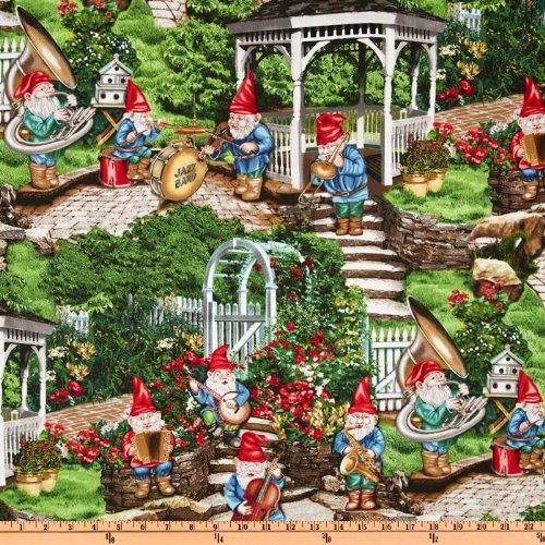 44'' Wide Michael, Designed for Michael Miller Fabrics this cotton print features a large scale design of gnomes playing musical instruments. The gnomes measures about 5'' tall. Colors include green grey red blue brown and gold.